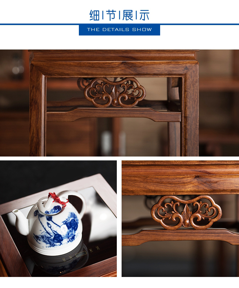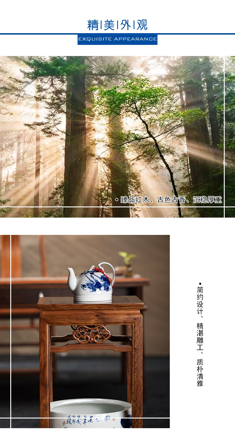 臻品花梨材質(zhì),古色古香、沉穩(wěn)厚重;陶瓷手繪壺、手繪缸,古典優(yōu)雅,光澤耐久。
